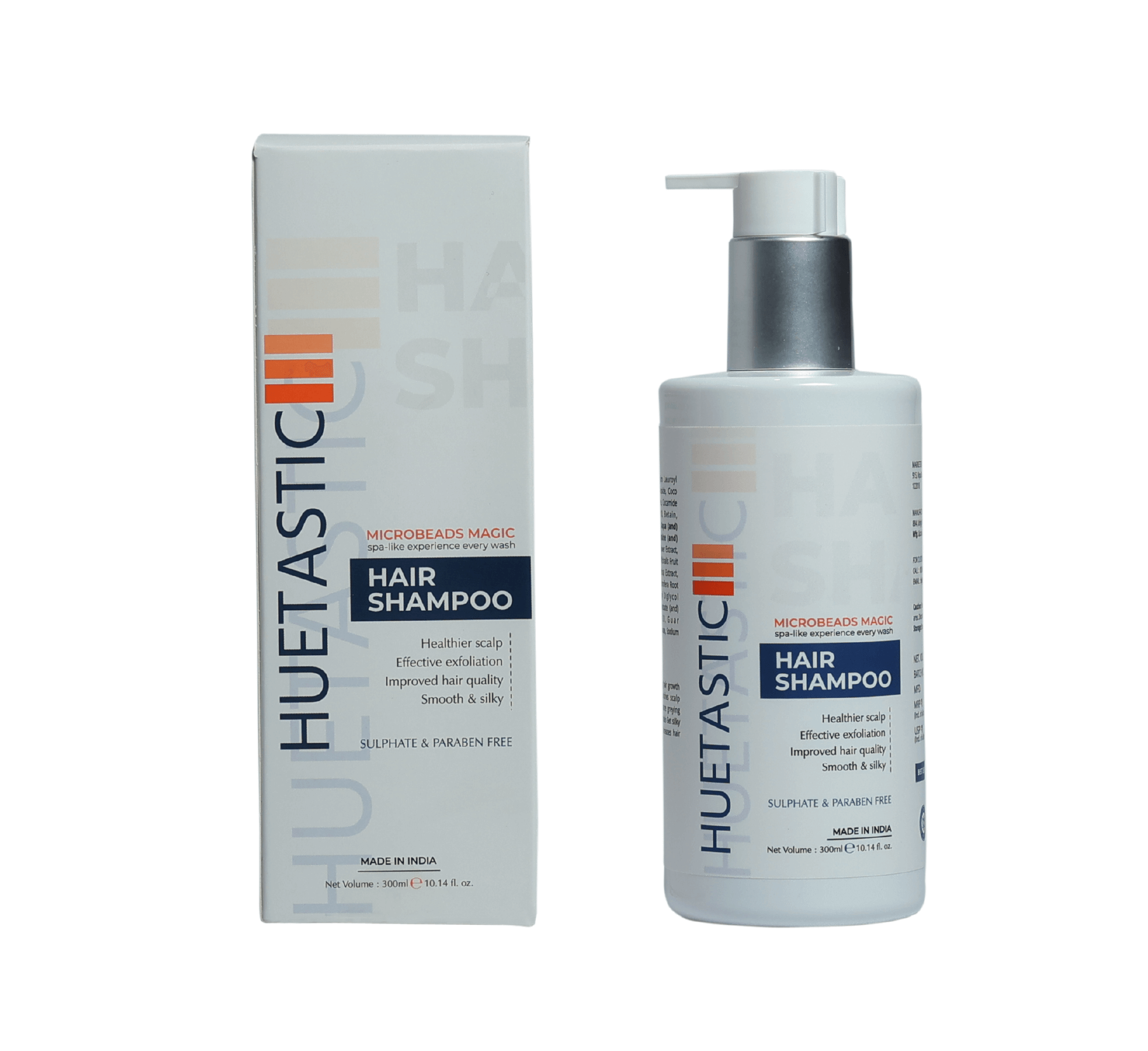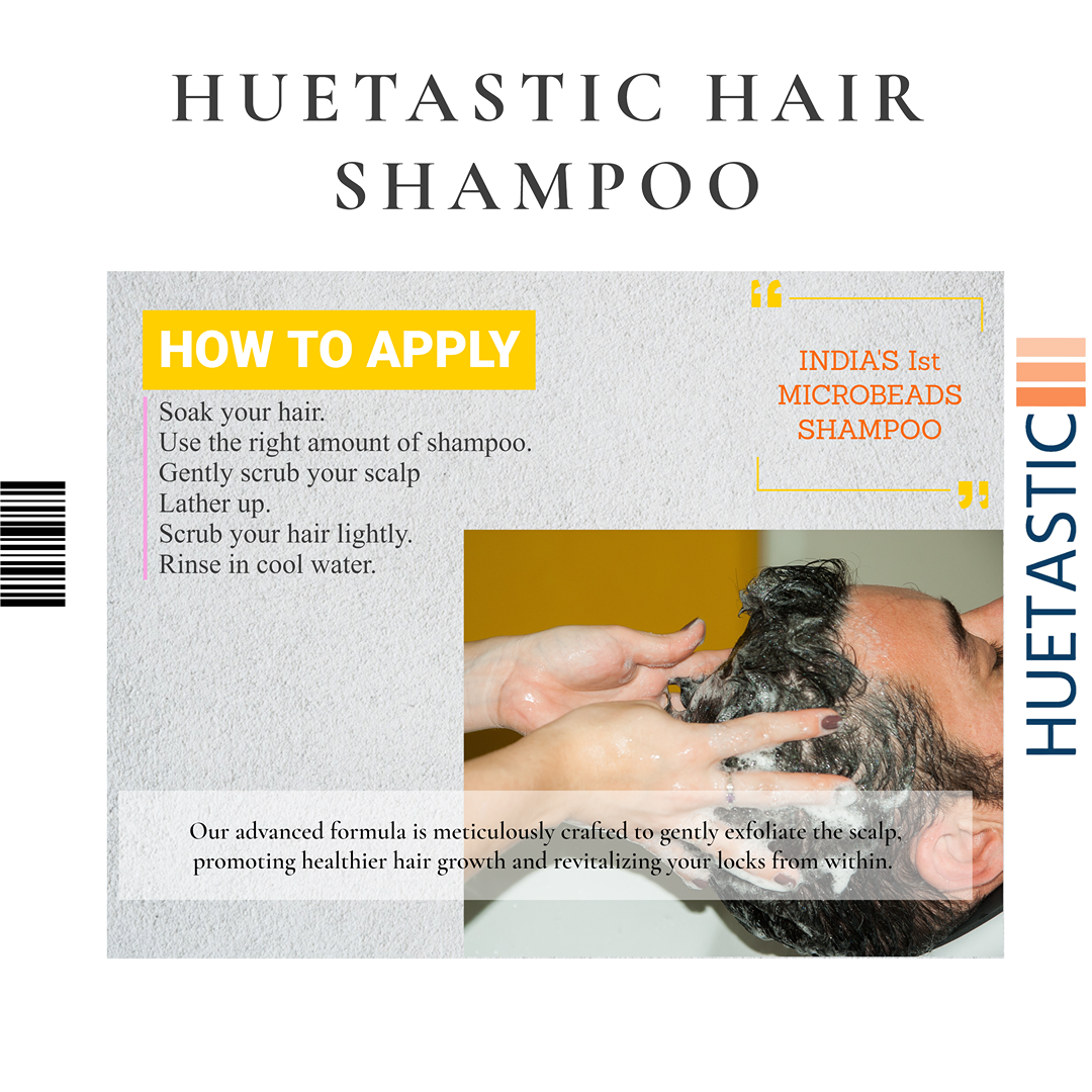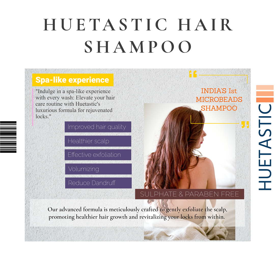 Huetastic Shampoo, the first of its kind in India to harness the power of microbeads. Our advanced formula is meticulously crafted to gently exfoliate the scalp, promoting healthier hair growth and revitalizing your locks from within.